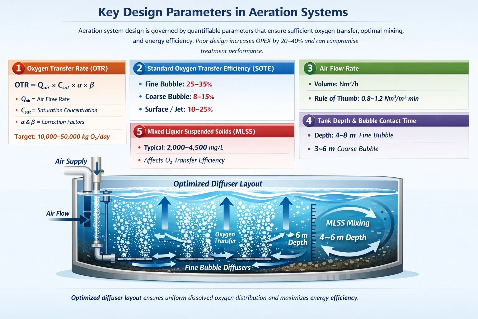 بهره وری انرژی: هوادهی 40 تا 60 درصد برق کارخانه را تشکیل می دهد. بهینه سازی OTR و چیدمان دیفیوزر می تواند مصرف را 15 تا 35 درصد کاهش دهد.