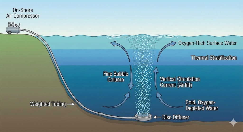 هوادهی پراکنده زیرسطحی بهترین انتخاب برای دریاچه های عمیق تر از 8 فوت است. برخلاف فوارههای سطحی که فقط لایه بالایی آب را اکسیژن میدهند، سیستمهای زیرسطحی استفاده میکنند دیفیوزرهای دیسک حباب ریز در پایین برای گردش کل ستون آب، اطمینان از رسیدن اکسیژن به مناطق عمیق که ماهی ها و باکتری های مفید در آن زندگی می کنند.