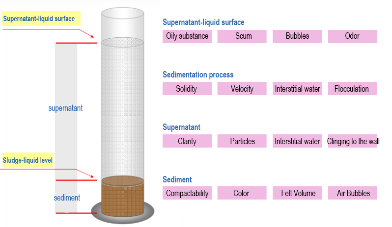 | سرعت تسویه | سرعت لخته سازی اولیه و میزان ته نشین شدن آزاد و لخته. سرعتی که در آن رابط لجن و آب تشکیل می شود. | 1. فعالیت لجن فعال (بالاتر = سریعتر). 2. پیری لجن (پیرتر = کندتر). 3. سمیت لجن (سمی = کندتر). 4. ویسکوزیته لجن (بالاتر = کندتر). 5. حجم دهی رشته ای (به طور کلی کندتر). 6. غلظت لجن (ته نشین شدن زودرس لخته). 7. محتوای جامدات معلق (بالاتر = کندتر). 8. درجه حرارت و ویسکوزیته آب. |