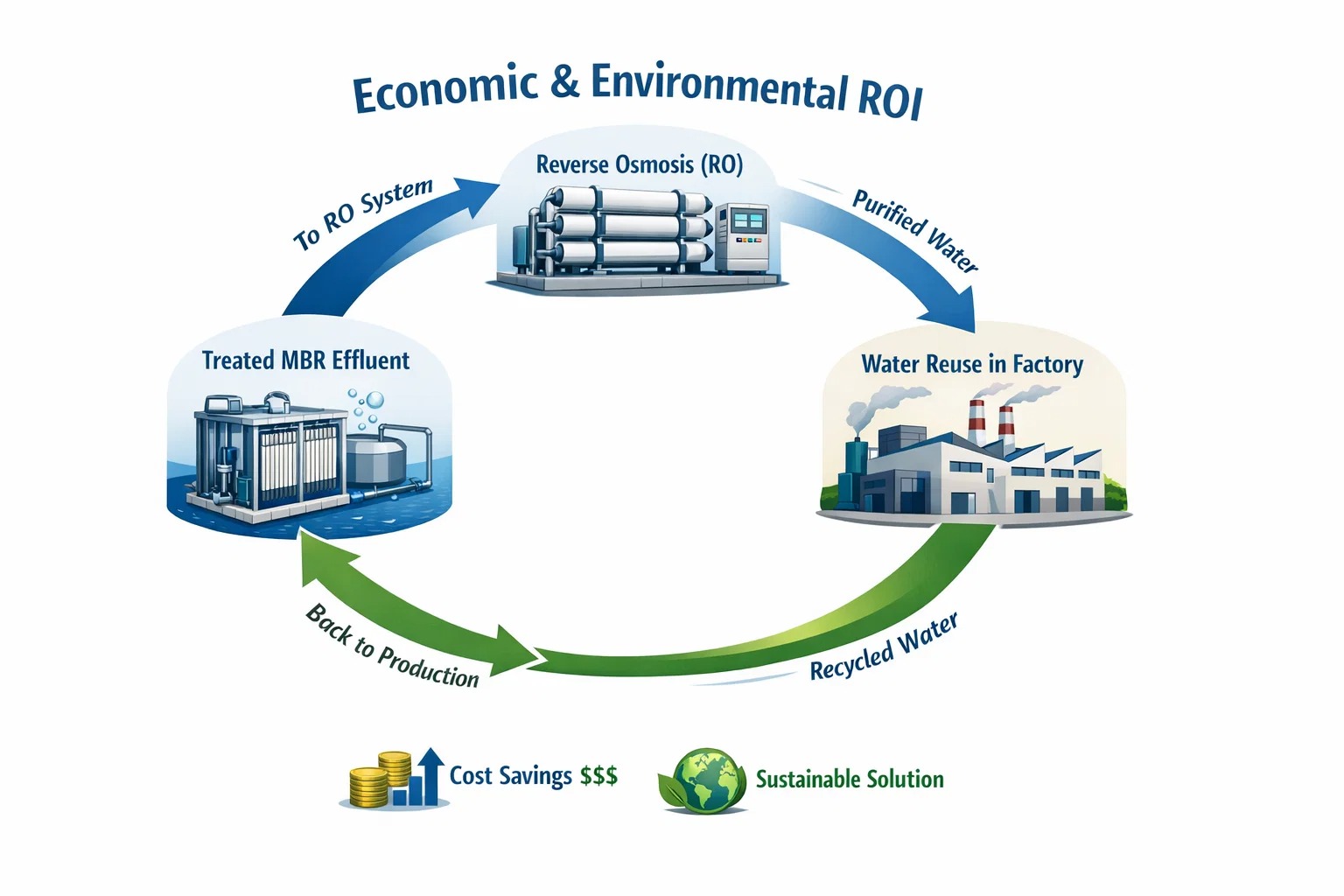 برای صنایع دارویی و نساجی، آب یک هزینه سربار هنگفت است. پساب MBR آنقدر تمیز است که می تواند به عنوان خوراک مستقیم برای آن استفاده شود اسمز معکوس (RO) .