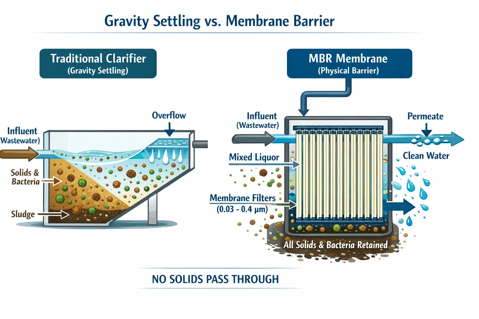 در یک کارخانه معمولی، شما با سرعتی که یک ذره می تواند غرق شود محدود می شوید. در MBR از a استفاده می کنیم مانع فیزیکی غشاء (معمولا 0.03 تا 0.4 میکرومتر).